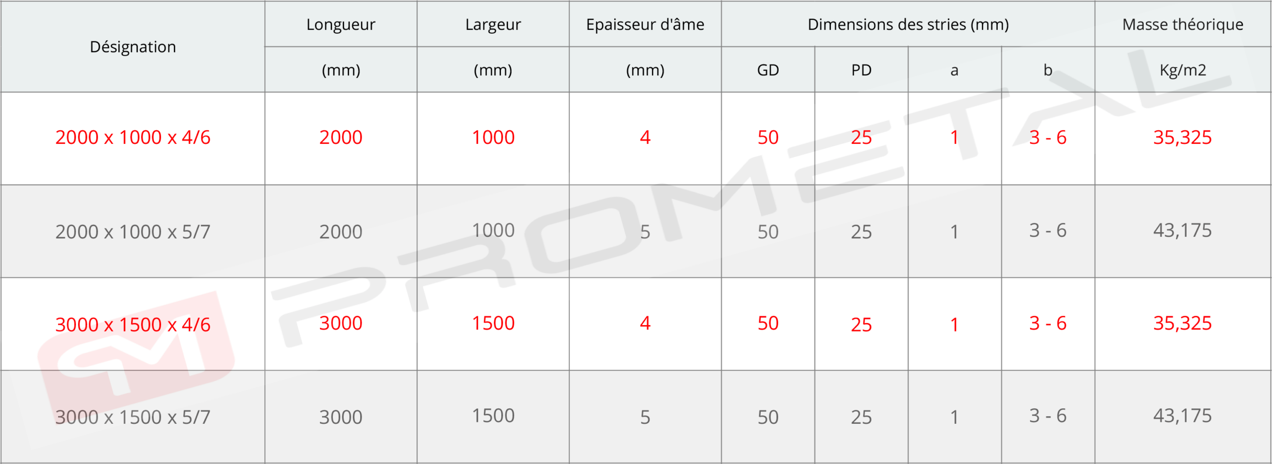 Tôle avec relief strié. Désignation : Longueur X Largeur X Épaisseur du Noyau / Épaisseur Maximale. Nuance d'acier : S235 JR (EN 10025).
