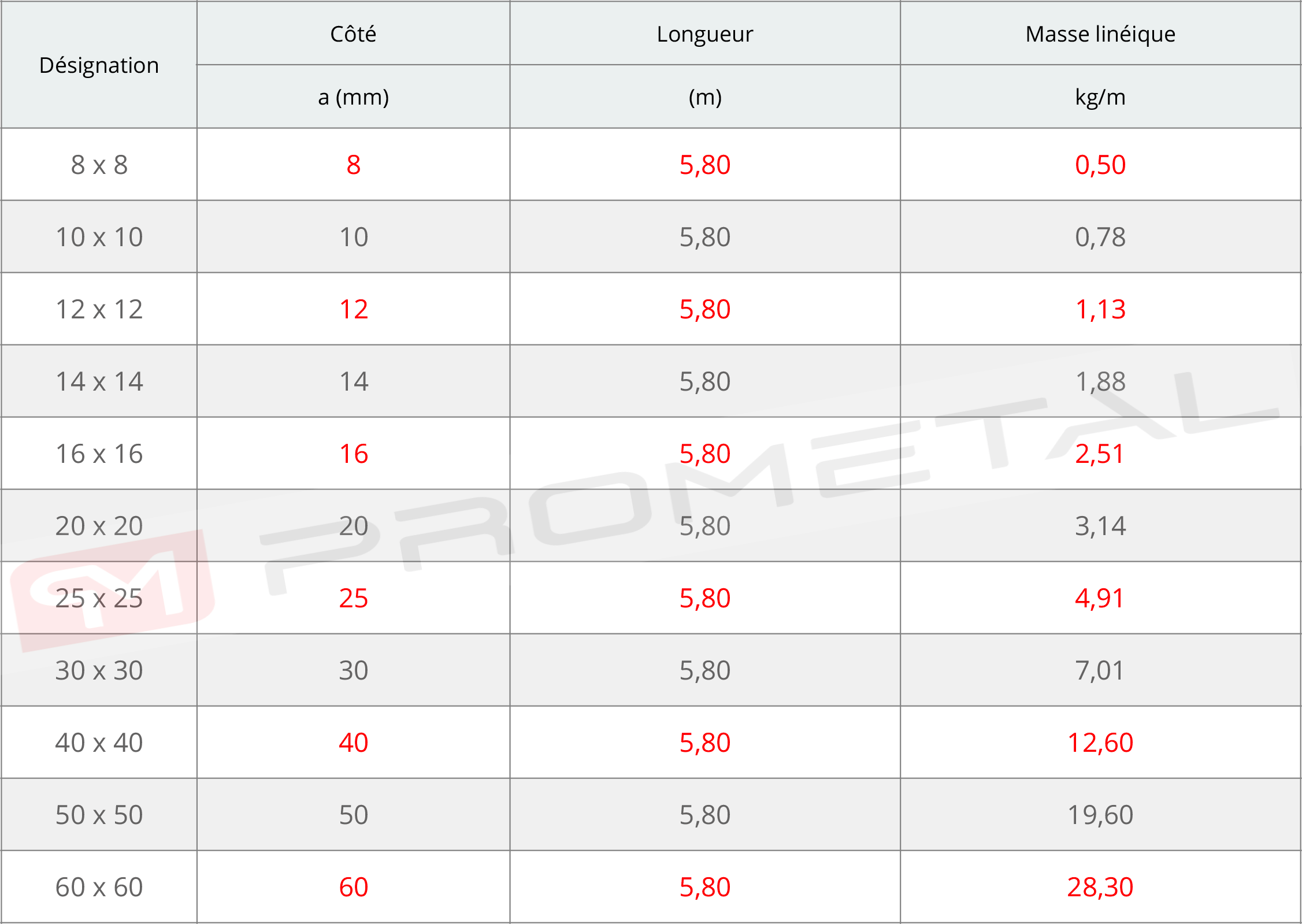 Fer carré laminé à chaud Désignation : Côté à côte. Qualités d'acier : S235 JR et S275 JR (EN 10025).