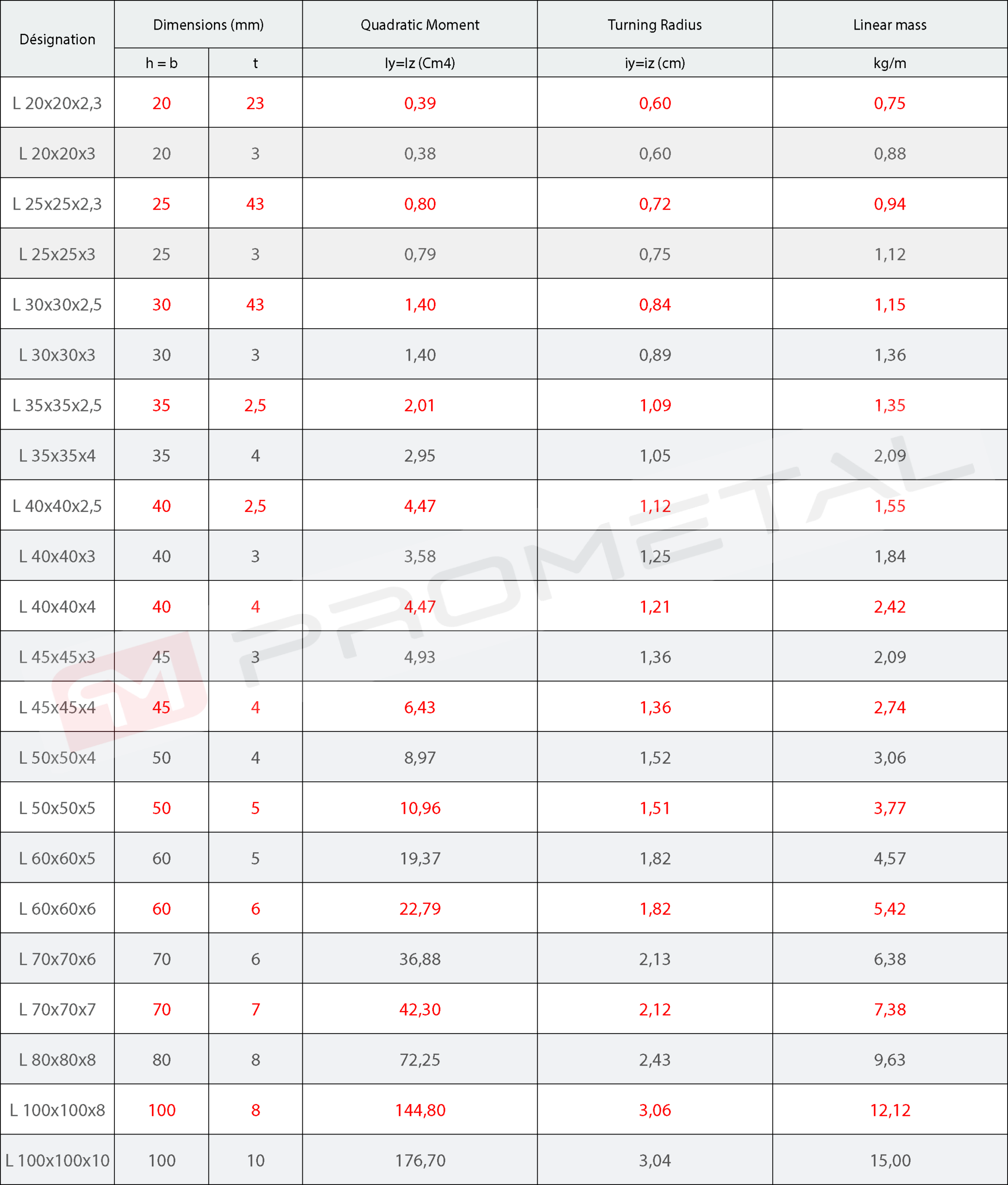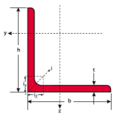 Angle bar with equal flangess. Designation: L + Wing width x Thickness. Steel grades: S235 JR and S275 JR (EN 10025).