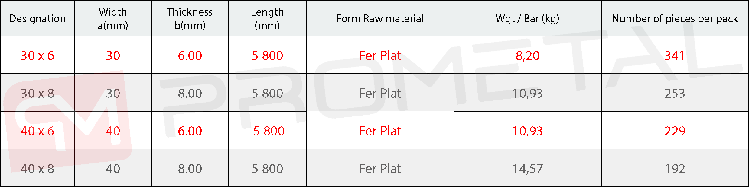 Decorative flat iron. Designation: Width x Thickness. Steel grades: S235 JR and S275 JR (EN 10025).