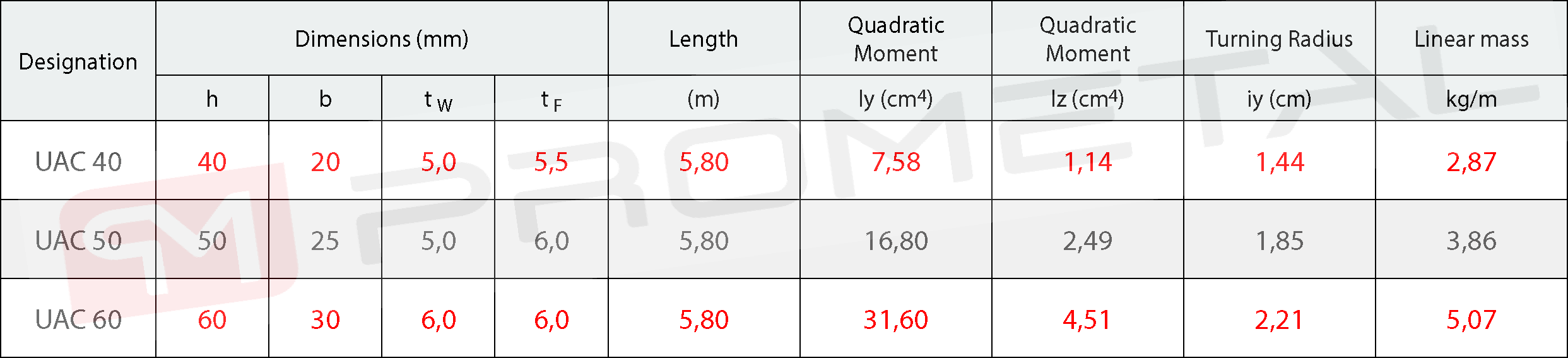 Normal profile UAC. Designation: UAC + Height of the core. Steel grade: S275 JR (EN 10025).